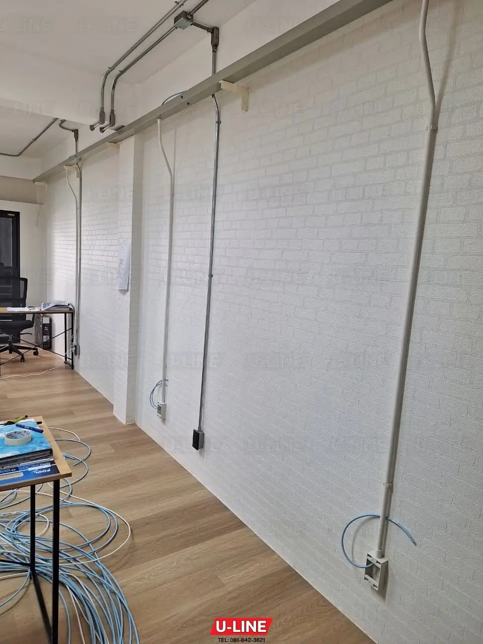 งานเดินสายแลน(LAN) สำหรับอินเตอร์เน็ต(Internet)และกล้องวงจรปิด(CCTV) ร้อยท่อและติดตั้งเต้ารับสายแลนในบริเวณพื้นที่โต๊ะทำงาน พร้อมจัดเก็บสายแลน(LAN)ด้วยรางธรณีประตู, ราง Wireway และจัดสายภายในตู้แร็ค (Rack) ภายในสำนักงาน Origin ซอยแบริ่ง 12 โดยทีมช่างจาก บริษัท ยู-ไลน์ ซิสเท็มส์ จำกัด